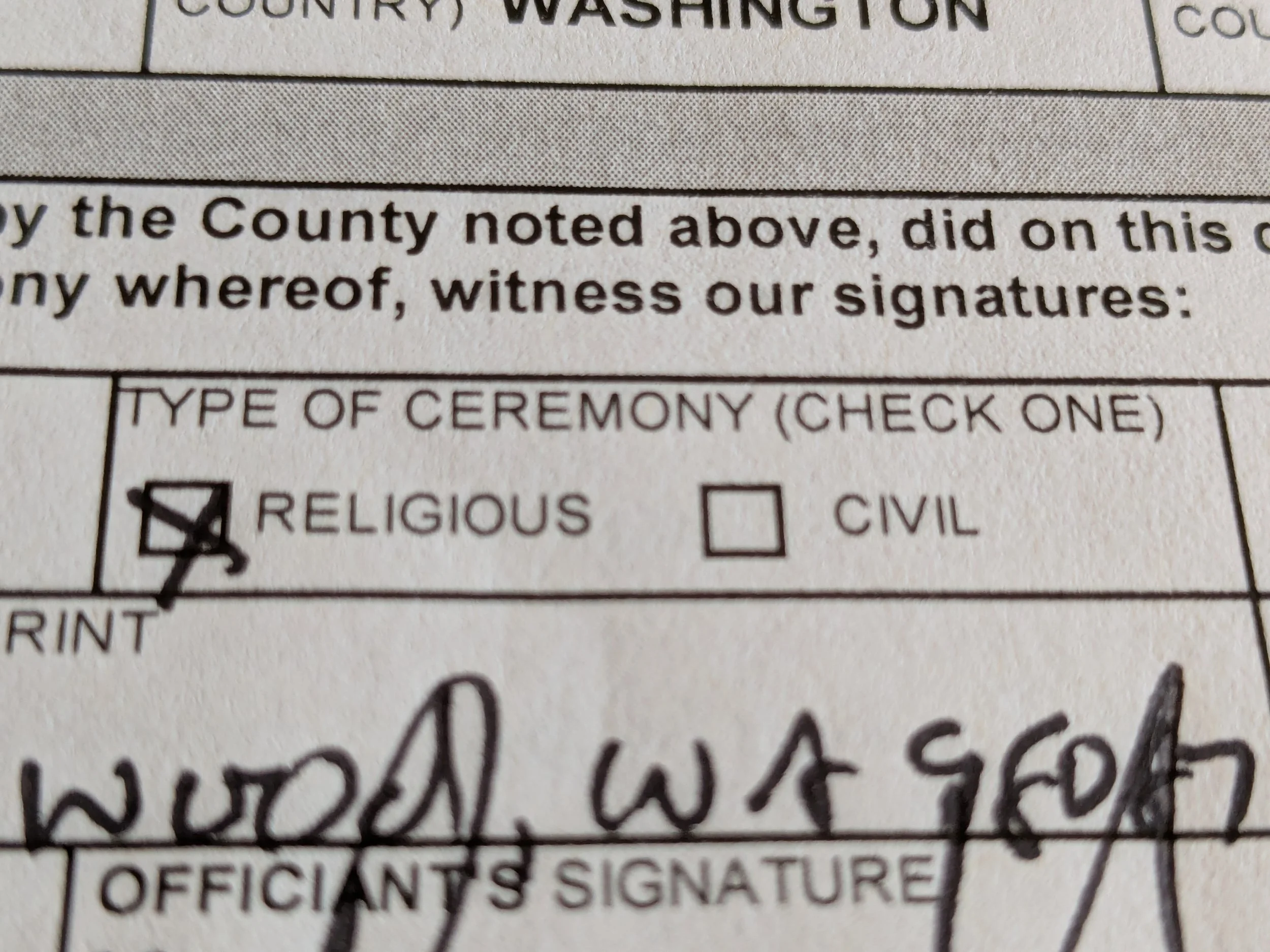 I’ve had a number of calls lately from couples about this. After purchasing certified copies of their marriage certificate, they notice that “religious” is checked off, even though they had a non-religious ceremony. This refers to the person performing the ceremony, not the type of ceremony performed. The only people allowed to check “civil” are a judge, justice of the peace or similar government official. Everyone else, from the Pope to little old me, must check religious.
